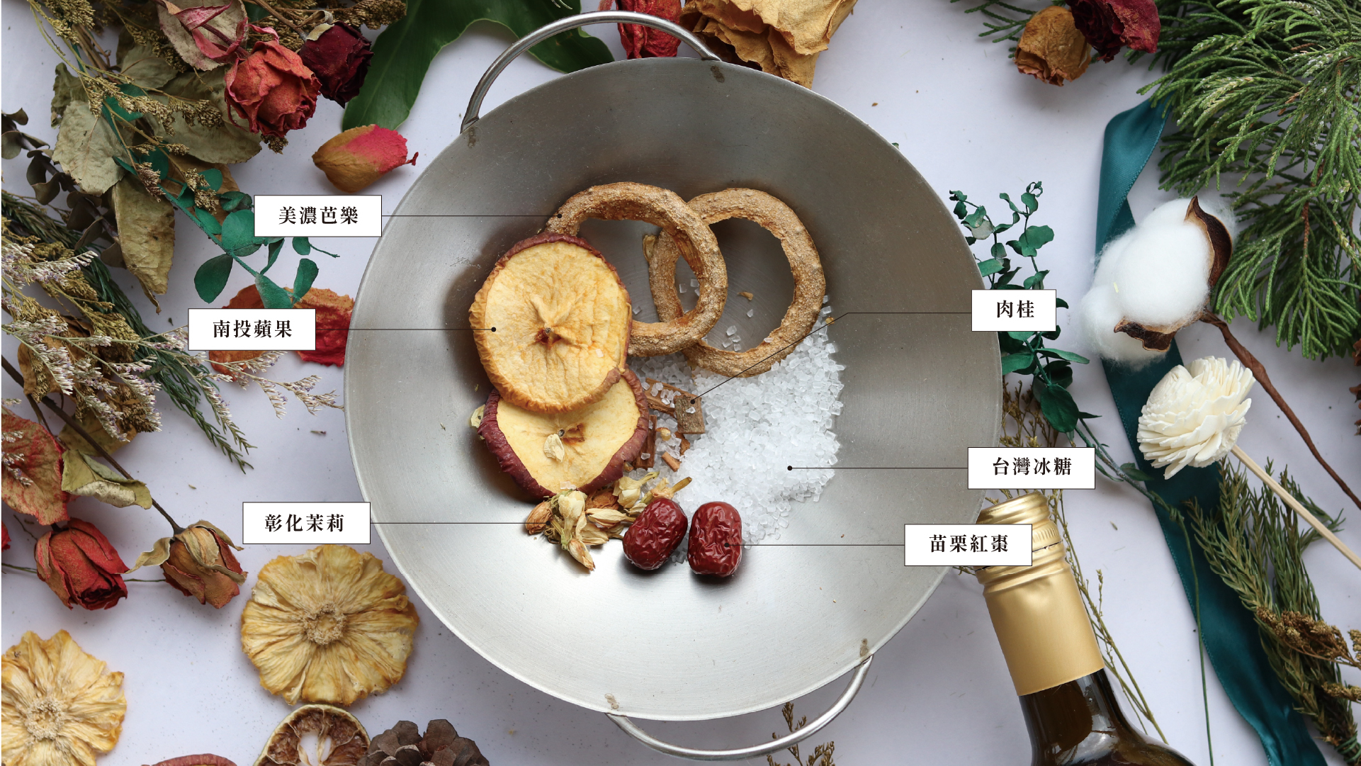 果嶼使用臺灣熬製冰糖、臺灣帝王芭樂片、臺灣南投蘋果、臺灣茉莉、臺灣土肉桂、臺灣苗栗紅棗,